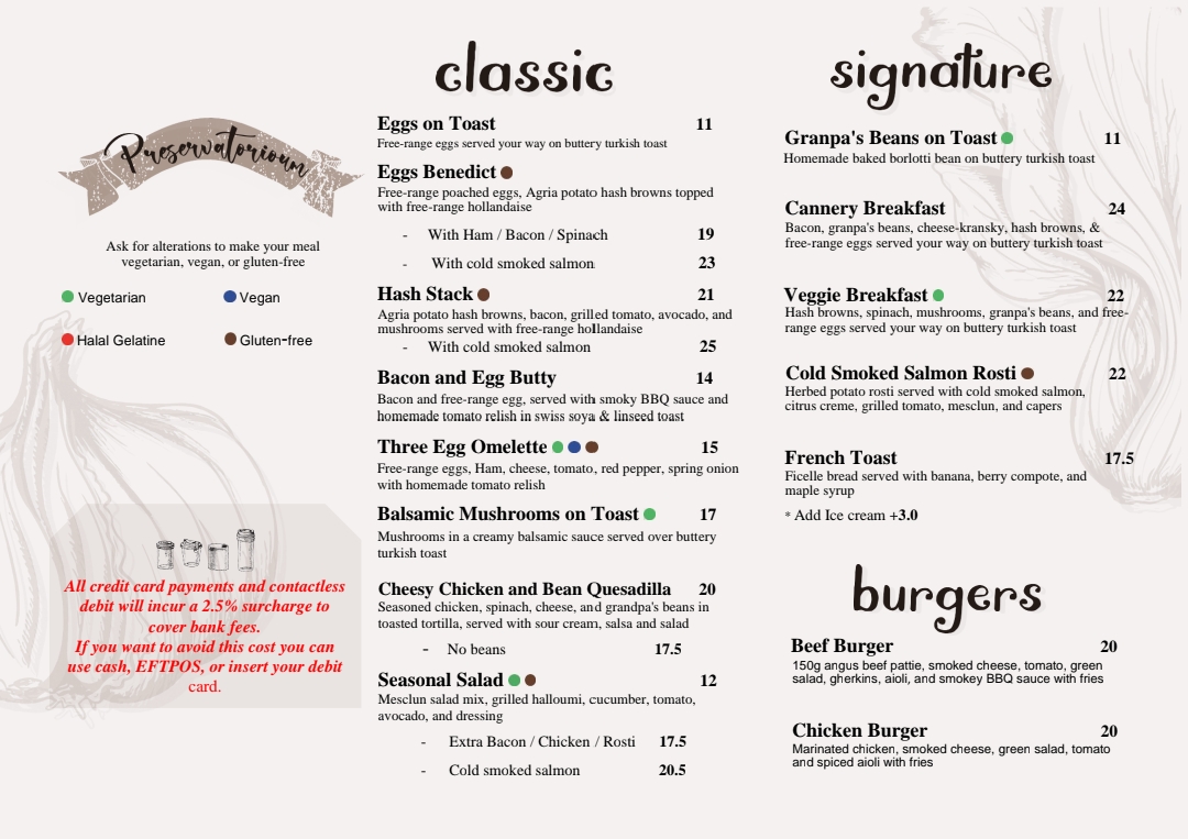 Welcome to Preservatorium Cafe, a charming haven nestled in Mount Cook, Wellington. This eclectic cafe showcases a delightful menu that emphasizes locally sourced ingredients while serving all-day breakfast favorites. Signature dishes include the Cannery Breakfast, packed with bacon, cheese kransky, and homemade beans on buttery Turkish toast—a delightful way to start your day at NZ$25.50.
